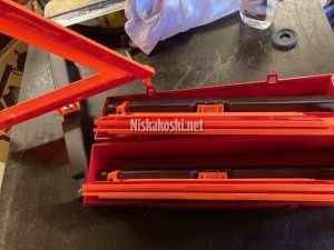 Här känns det som logiken spretar. Speciellt när jag betänker att jag nu låter minst 3 hyllmeter med tidskriftssamlare i plast husera på en av hyllorna. Två uppsättningar av den eminenta norska uppfinningen slirskyddet Knipetak, båda med den udda förvaringsväskan av hockeytrunks modell. En uppsättning amerikanska varningstrianglar godkända för bruk exempelvis i specifika delstater(?!). I det här fallet säger delstaternas reglemente att det ska vara 3 trianglar i varje fordon. Följdriktigt så är det tre sånna i en plastbox. Jag vill minnas att den kom med den ambivalente Nissan Pulsar jag ägde för typ tio år sedan. Varför den ju fått given plats i hyllsystemet känns som en tveksam prioritering kontra annat som fått respass.